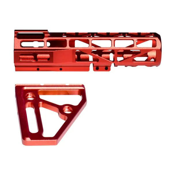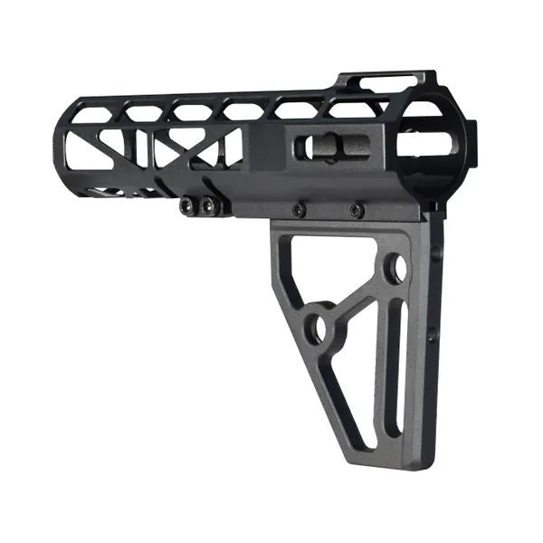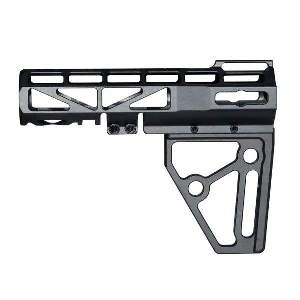 Super lightweight Skeletonized Aluminum construction. 2 piece kit includes the brace and fin. Fits 1.25" tubes. 2 screw clamp system to hold to tube securely. Includes 2 M-LOK slots and 2 QR release holes.